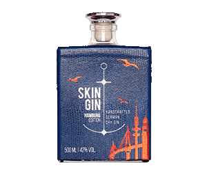 Die handverarbeitete 0,5l-Flasche in blauer Lederoptik ist mit silbernen und roten Heißfolienprägungen auf allen Seiten veredelt. Das auffällige Motiv der Fischsommelier Edition ist ein Highlight für jeden Fischliebhaber – Nich lang schnacken, Kopp in Nacken! Neben klassischem Wacholder spielt bei Skin Gin die Marokkanische Minze die Hauptrolle. In Kombination mit Zitrusfruchtschalen von Orangen und Pink Grapefruits aus Spanien, Limetten und Zitronen aus Italien sowie Koriander aus Vietnam ergibt sich ein unverwechselbar frischer und zugleich milder Geschmack. Das exklusive Design unterstreicht dabei den hochwertigen Inhalt. Jede Flasche wird aufwändig per Hand mit heißgeprägter Lederfolie umwickelt und ist damit ein echtes Unikat.